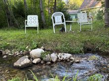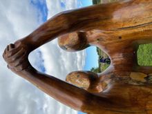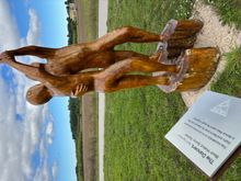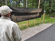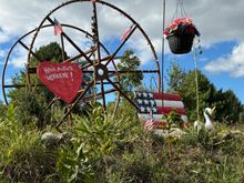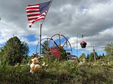 Now is when you let your eyes direct you to the frequent distractions along the way. The bright yellow caboose of the TART Line beckons you to jump on and call out “Allll Aboard!” Mile after mile, savor the variety of wildflowers and brightly colored berries. There are Lady Slippers, and flowers that come in joyous shades. You’ll find red berries with green stems, and purple berries with red stems. Along the way, you’ll see works of art, like a wood carving of an indigenous canoe, and a wooden statue of “The Dancers.” Then look for an American flag with a collection of what some may consider discarded household items, but the collection of plastic reindeer, swans, and potted flowers becomes a thing of beauty. It might just be a great place to rest for a moment.