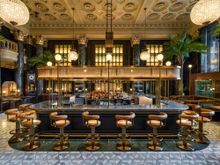 Guests are encouraged to begin their evening at Bourbon Lounge, which blends preserved architectural details from the Westin St. Francis. Framed by a custom satin brass and metalmesh gantry, the central bar is set beneath the original hotel's intricately molded ceilings and green marble columns. Green velvet and leather seating, botanical chandeliers, and a stained-glass feature wall by Bay Area artist Theodore Ellison complete the immersive setting, inviting guests to gather before dinner or continue their night after a meal. Seventeen-foot King Palms flank the entry, enhancing the tropical sensibility and offering a memorable sense of arrival.
