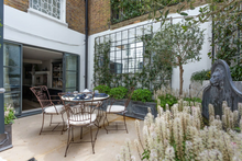- Green House is a charming four-bedroom villa located in the Knightsbridge neighborhood of London. Spanning four floors, the villa offers a comfortable and elegant setting ideal for families. The upper levels include four bedrooms and two en-suite bathrooms, while the main level features two living areas, including a TV room with an extensive book collection. On the lower level, the kitchen opens to a private outdoor courtyard with a water fountain, an ideal spot for quiet afternoons or casual dining.